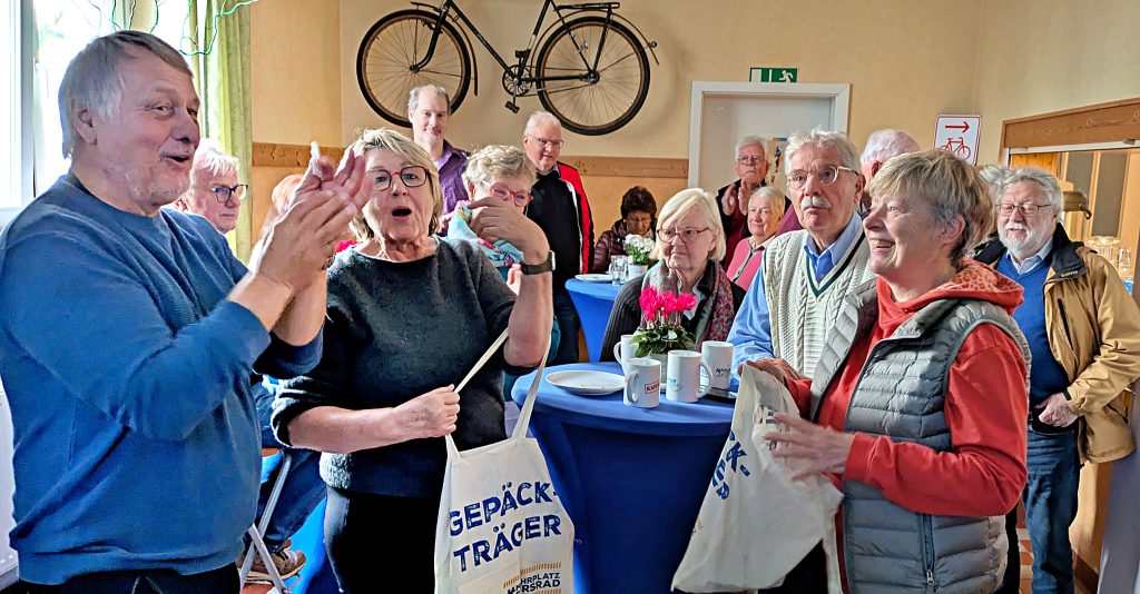 Beim diesjährigen Herbstfest des ADFC Kreisverbandes Münsterland e. V. am 19. Oktober in der Fietserei ehrte der 1. Vorsitzende Manfred Döpper die beiden Radtourenleiterinnen Maria Heinemann und Theresa Ostendorf für ihre langjährigen Dienste für den Club. Hierbei überreichte er beiden je eine kleine ADFC-Tragetasche, die mit Präsenten angereichert war. Beide Radtourenleiterinnen geben aus Altersgründen nunmehr den Staffelstab an jüngere TourGuides weiter. Ihr Wissen um die schönen Ziele bei den vielen Kleeblatttouren oder zuletzt bei den Touren Leezenliebe & Kaffeedurst geben sie dabei gerne an potenzielle Nachfolgerinnen und Nachfolger weiter.